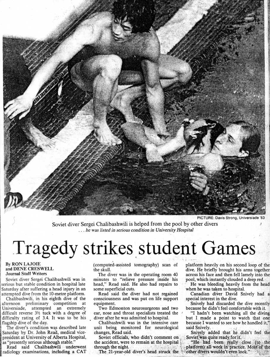 좀 오래된 신문입니다. 아마도 우산님은 동네에서 애들하고 고무줄하고 소꿉장난 하던시절 아니었을까 생각합니다. 유니버시아드 게임에서 소련선수가 다이빙보드에 부딪혀 죽었을때 소련선수를 물속에서 구출해내 한동안 유명세를 탔던 그런 사진 입니다. Edmonton의 한 기자가 찍은 사진이며 Edmonton 저널 1면 톱기사로 올라왔던 사진입니다. 그리고 저의 모습입니다. 권상우보담 멋진몸매라는거 알겟죠?