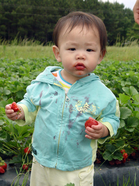헝클어진 머리에 딸기로 뒤범벅된 입과 옷하며..