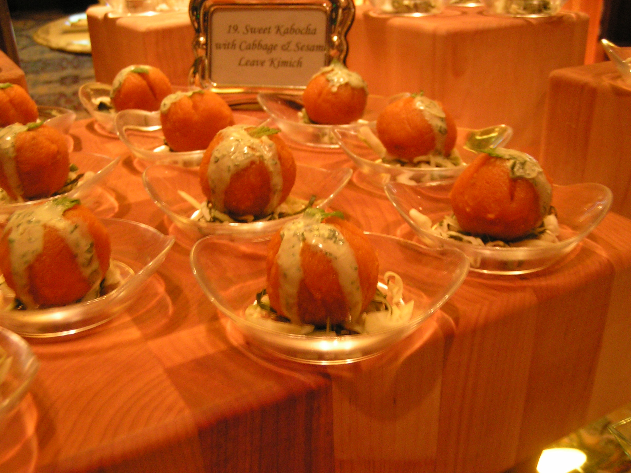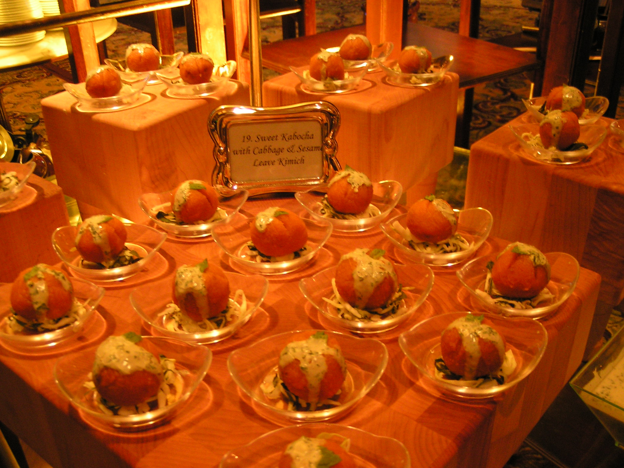 호텔에서 조리사들끼리 음식 출품대회가 있었는데, 제가 출품한 호박란을 조금 변형 시켰습니다. 단호박을 조릴때, 버터, 헤비크림등을 이용하고 그 안은 닭과 여러해산물, 그리고 야채들로 볶아 채웠고, 소스는 플레인 요거트와 녹차가루, 그리고 민트를 이용했습니다. 맛있어 보이나여? ㅎㅎ