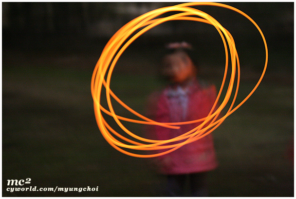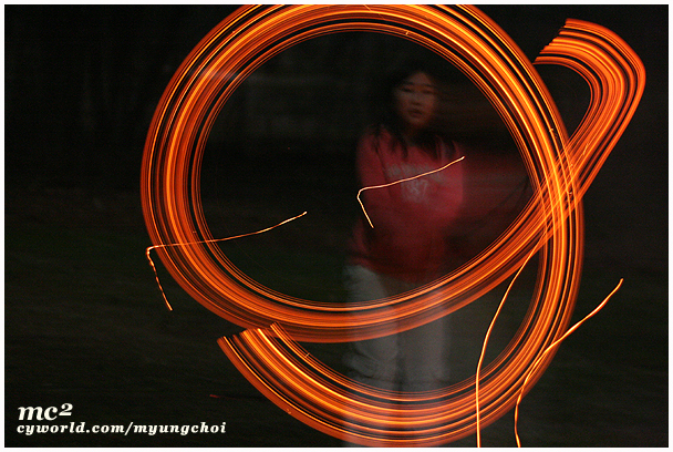 조리개 최대개방하구요. ISO도 만빵올리구요. 아이들에게 되도록 몸은 움직이지 말라고하고요, 캠프파이어 할때 머쉬멜로 구워먹는 나뭇대기를 불에 넣고 빨갛게 만든후에 꺼내서 돌릴때 찍으면 됩니다. 되도록 움직이지 마시구요. 삼각대를 쓰면 더욱 좋겠죠?! ^^